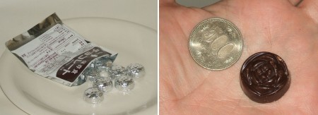 袋から出したばかりのMary'sチョコ(左)と、一つ銀紙の包み紙をとってみたところ(右)。500円玉より一回り小さい程度の大きさ。