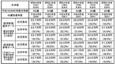 しかし例えばレポート内の別表を見ると、2051年における現役男子の平均賃金は手取りで72.4万円(2006年は38.0万円)と2倍近い数字となっている。