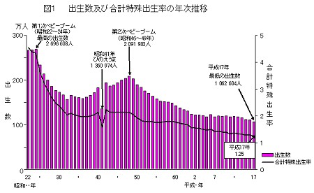 【直前の記事】の試算にもあるように、有効な人口政策や生産力向上政策がなされない限り、人口の減少やそれに伴う生産力・国としてのモチベーション低下は避けられない。2005年における出生率は1.25で、さらに今後減少する傾向にある(【厚生労働省・人口動態統計月報年計】※後に1.26に修正)。また、【内閣府の調査記録】を見ても、社会的・経済的支援が不十分なため、子育てを断念せざるを得ない家庭が多く、そのような状況を見て子どもを育むことそのものをあきらめる人が増えているのがわかる。