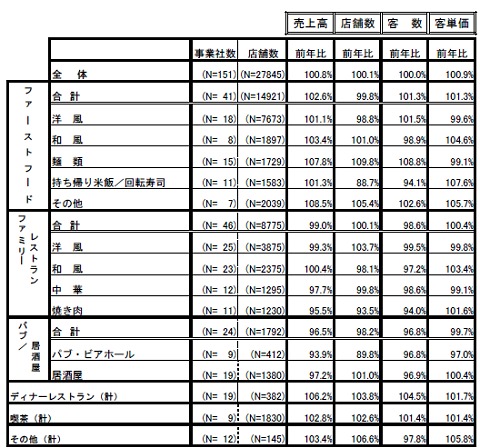 今調査はファストフードやファミレス、パブレストランや居酒屋、ディナーレストラン、喫茶店などを対象に行われたもので、対象数は事業者数が151、店舗数は27845店舗(既存店はそれぞれ148、23920)。年が変わったために先月より事業者数は大幅に増加しているが、店舗数は減っている。
