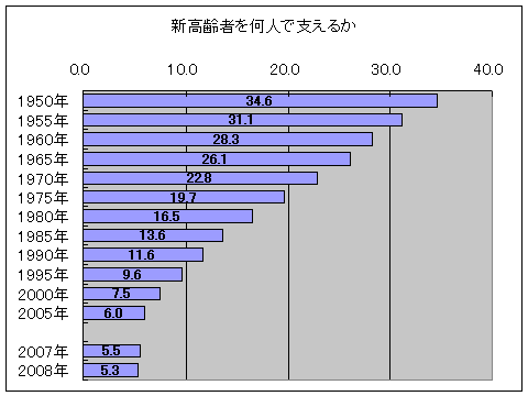2008年時点で「一人を5.3人が支える」という値となり、多少の状況改善が見られる。ただし人口構成比などにおける今後の傾向を見る限り、単に問題の先延ばしをしたに過ぎない感が強い。