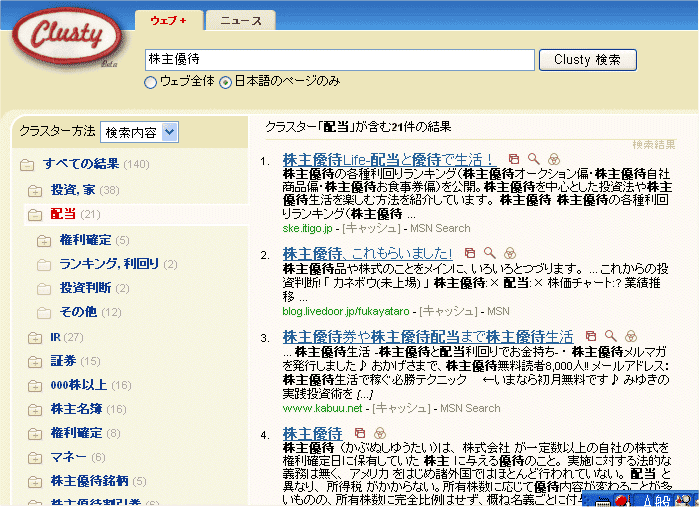【INTERNET Watch】によると、クラスタリングサーチエンジン技術のアメリカ【Vivisimo】は11月30日、日本語クラスタリングサーチエンジン【Clusty.jp】のベータ版を公開したと発表した(【発表リリース、英文】)。すでに英語版が公開されている「Clusty.com」の日本語版。