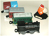 各車両はそれぞれが「ゼンマイ仕掛けの動力車」と「動力車に引っ張られる後部車両」でペアとして成り立っている。後部車両の方は内部機構が簡単な代わりにカーブレールが2枚付属。そしてペアの組み合わせが違っても、連結器部分は共通形式なので、当方のように別々な車両を組み合わせて走らせることもできる。